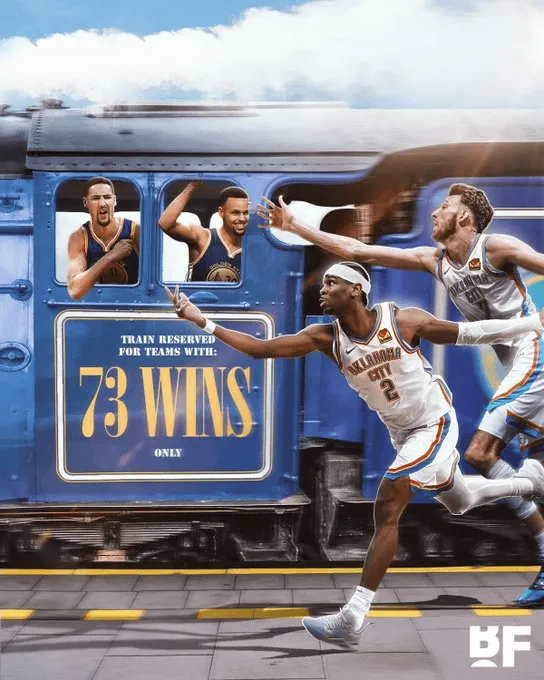 Basketball Forever晒出海报:雷霆再也无力追赶勇士73胜9负的常规赛历史纪录。